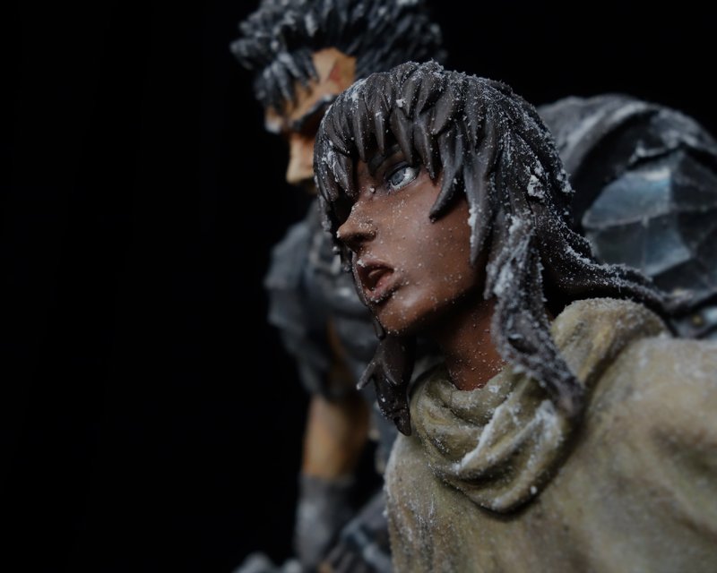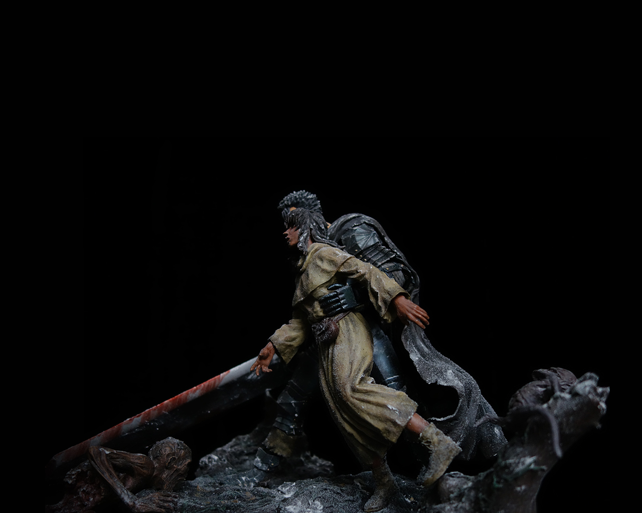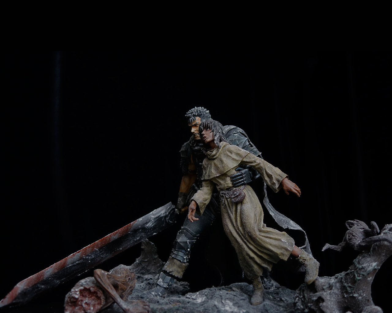 This work includes two statues: Guts and Casca, plus a diorama base.