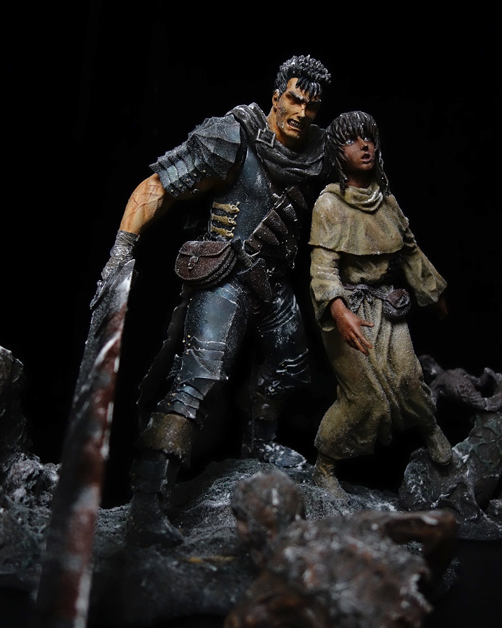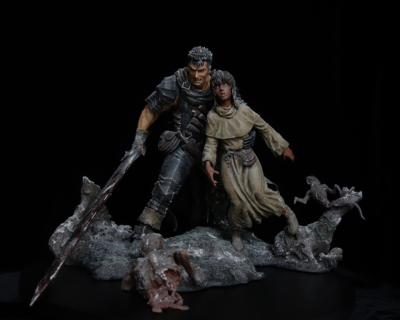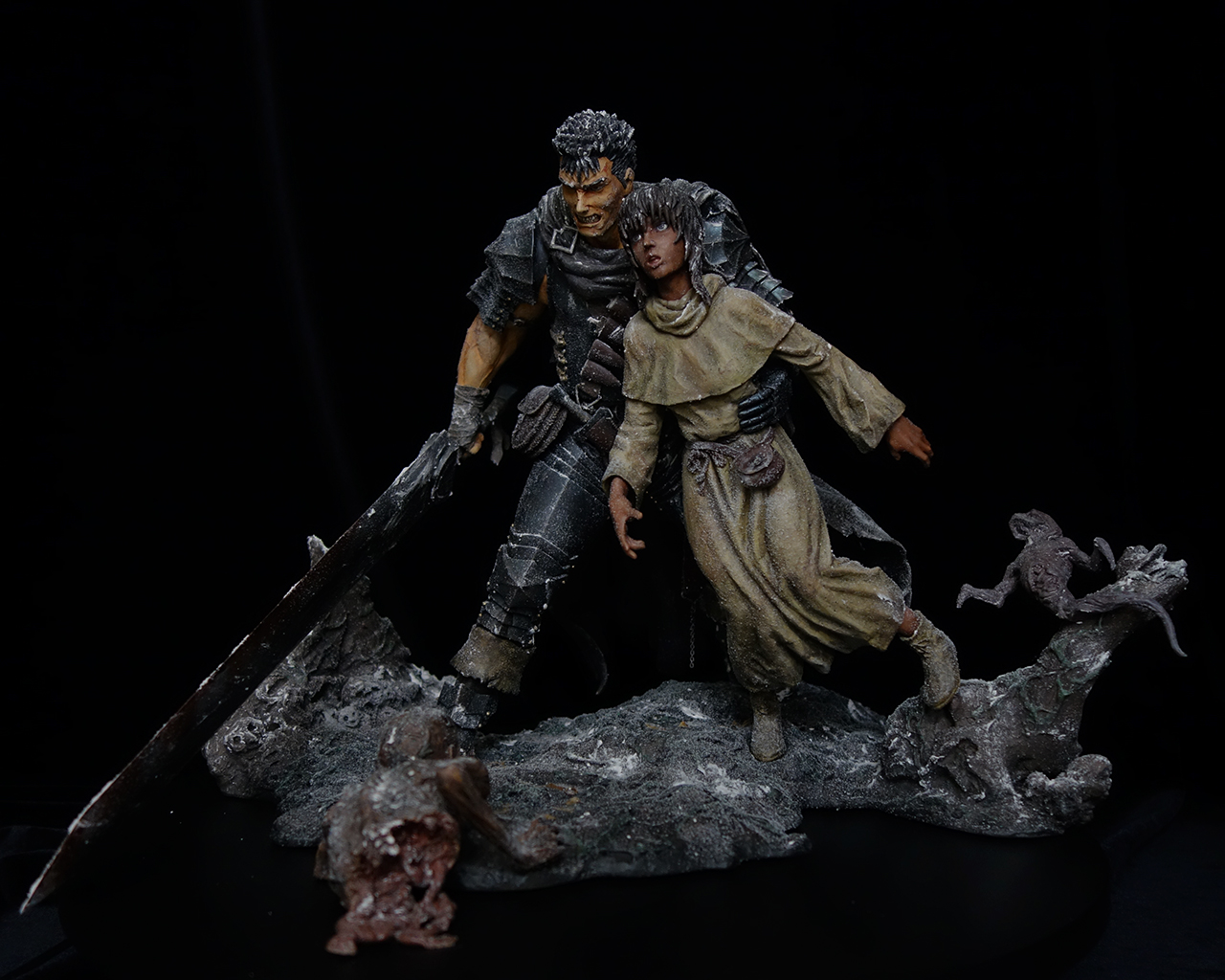 This work includes two statues: Guts and Casca, plus a diorama base.