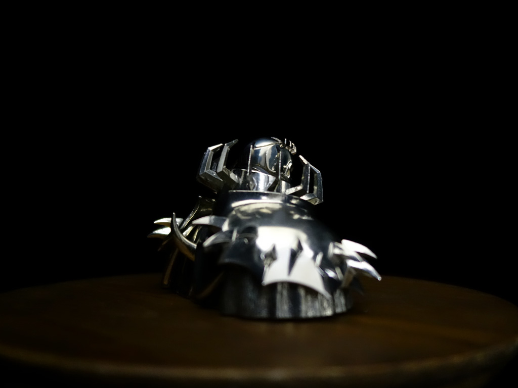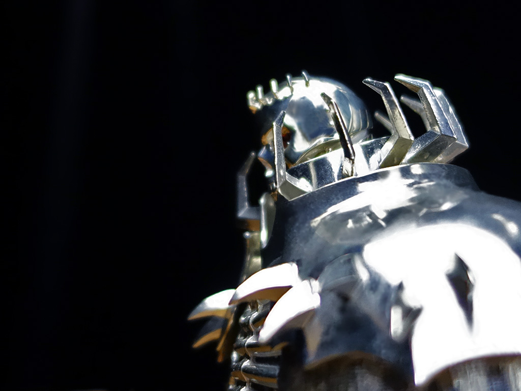 The spikes along the shoulders and neck are individually cast and soldered by hand, one by one. Even at close range, the joints are nearly invisible, demonstrating the extraordinary precision of Japanese artisans.