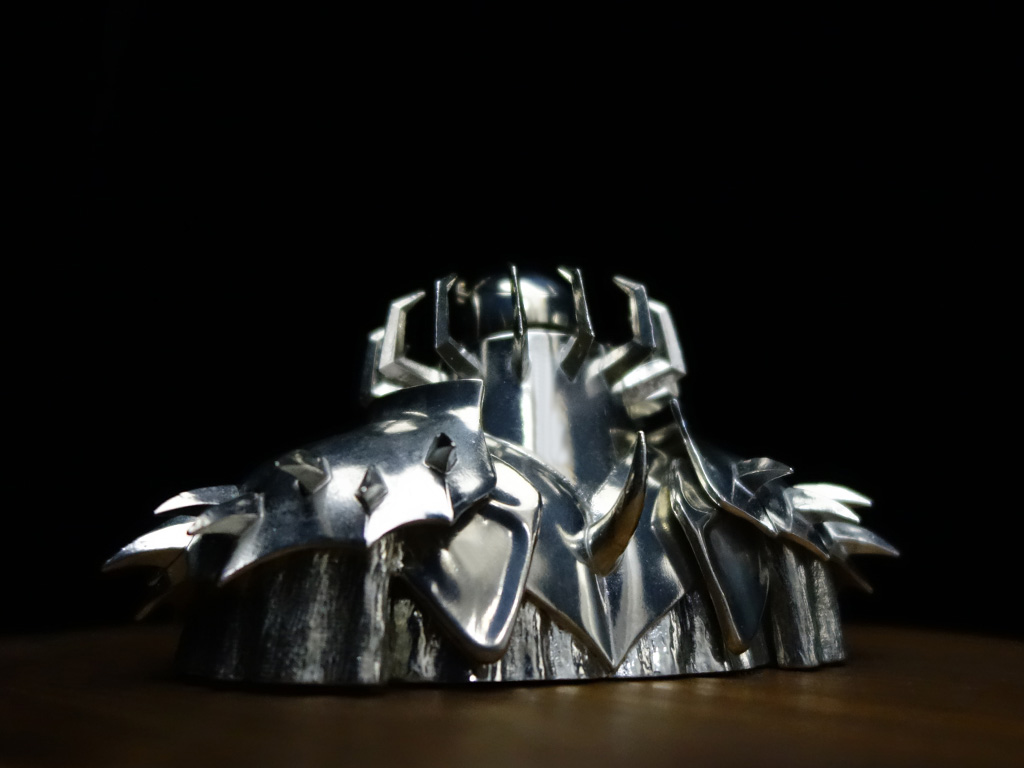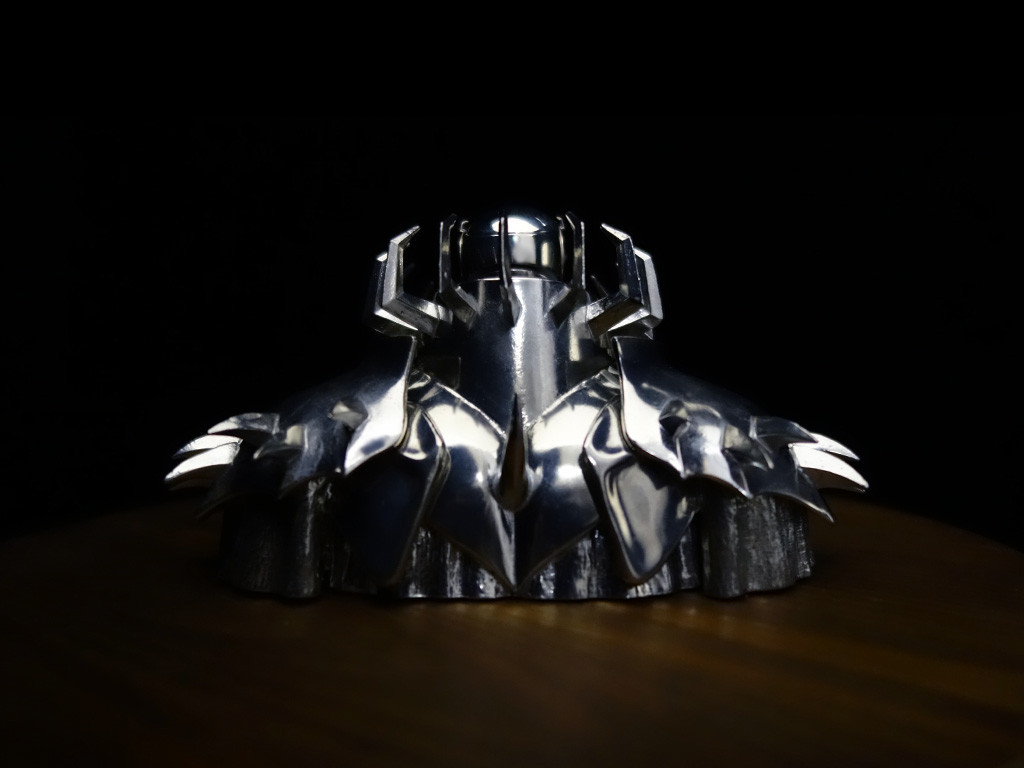 The cloak is intentionally left unpolished, preserving the natural surface of the metal and emphasizing its raw presence.